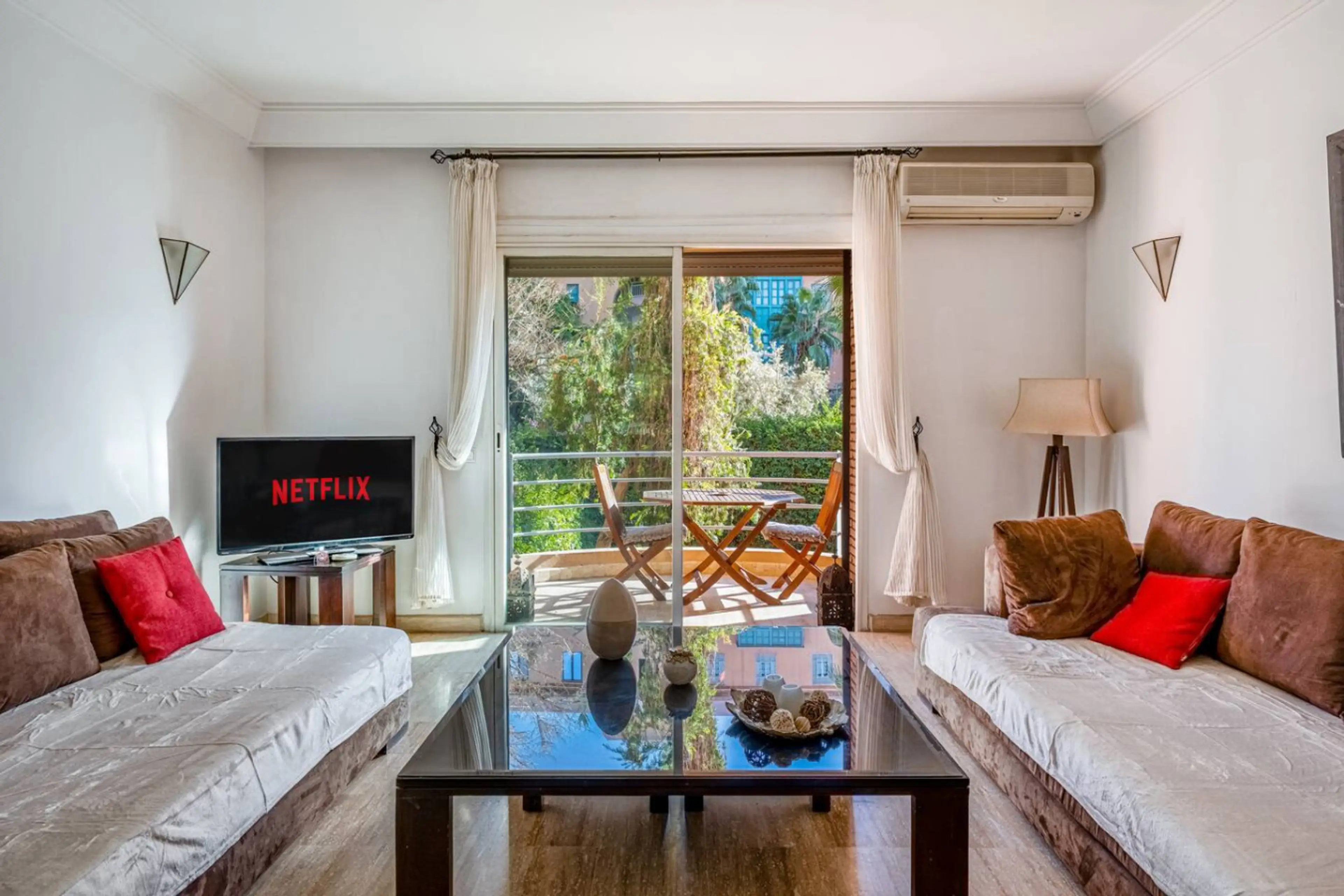 Welcome to your serene oasis in the heart of Marrakech, this bright and spacious 1-bedroom apartment blends modern comfort with authentic Moroccan charm, perfect for couples, lone travelers, or small families looking for a quiet getaway after touring the bustling city. Comfortable brown velvet sofa...